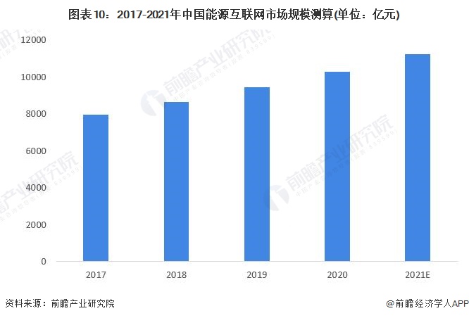 根据相关数据整理显示,2017年中国能源互联网市场规模为7950亿元。行业统计数据显示,2019年中国能源互联网市场规模达9420亿元,2021年约突破1.1万亿元。