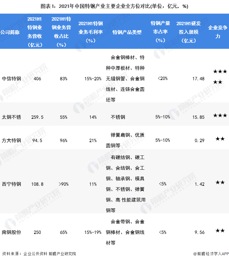 注:1)行业大部分企业未单独披露特钢业务数据,以上仅分析有相关数据披露的上市企业;2)企业出货量市占率参考2020年数据,大部分企业暂未公布2021年数据;3)上述企业并未单独披露特钢业务研发投入数据,在此仅能提供企业整体研发投入数据。