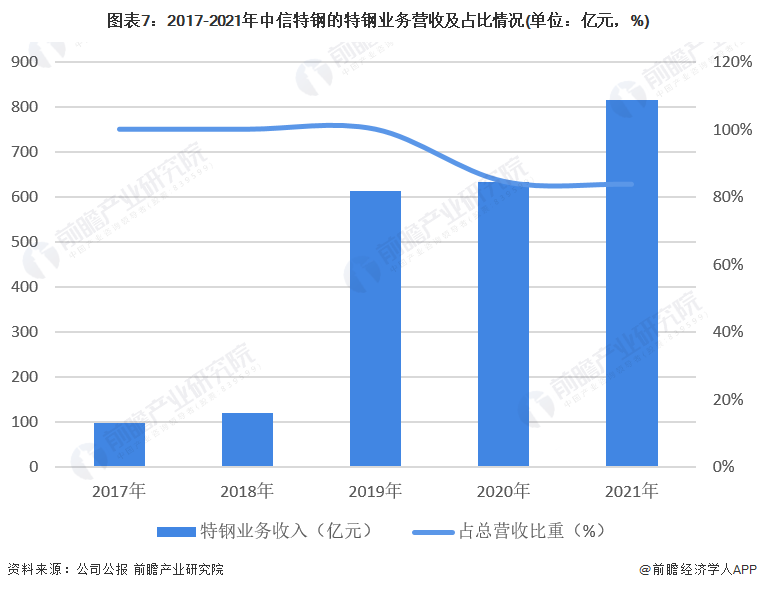 近年来,中信特钢的特钢业务营收呈现逐年增长态势,2021年全年超过800亿元;从特钢业务占总营收占比来看,自2020年开始呈现下降趋势,主要是由于企业向特钢下游延伸布局,逐渐完善企业的特钢产业链体系。