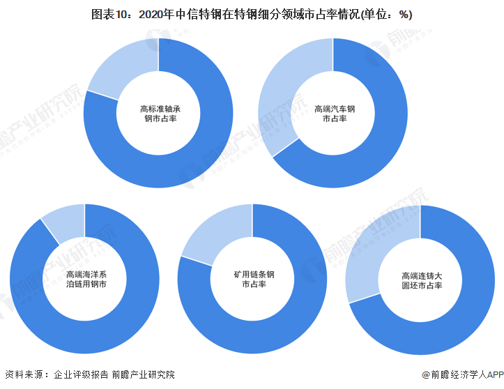 根据企业公开资料,中信特钢的高标准轴承钢产销量世界第一,中国市场占有率超过80%;汽车零部件用钢中国产销量第一,高端汽车钢中国市场占有率65%以上;高端海洋系泊链用钢的中国市场占有率超过90%;矿用链条钢中国市场占有率超过80%;高端连铸大圆坯中国市场占有率超过70%。