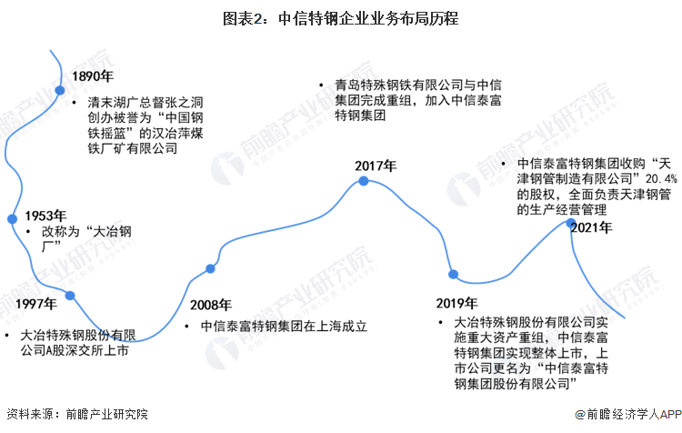 1890年,清末湖广总督张之洞创办被誉为“中国钢铁摇篮”的汉冶萍煤铁厂矿有限公司,并于1953年改称为“大冶钢厂”,之后经过一系列的兼并重组,改名为“中信泰富特钢集团股份有限公司”(简称为中信特钢,000708.SZ)并于2019年整体上市。