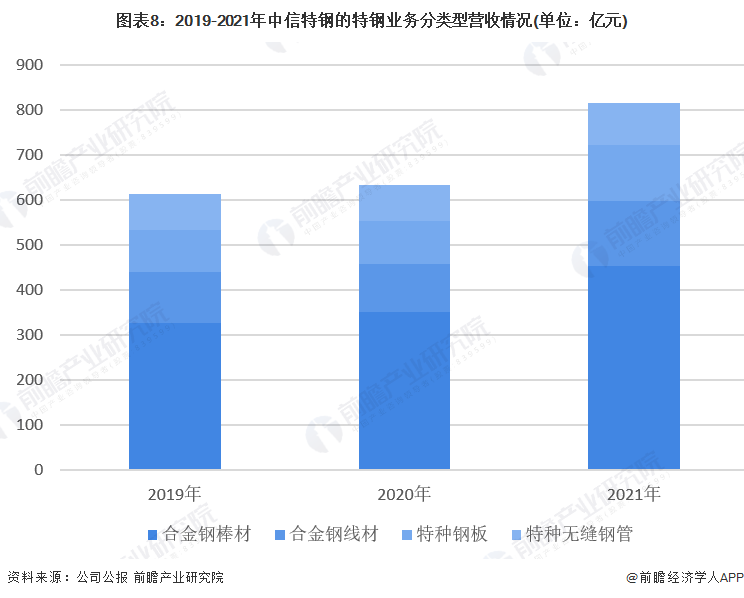 目前,中信特钢是国内特钢产业代表领先企业,并且在全球市场也占据重要地位。从企业经营情况来看,2021年上半年,中信特钢的特钢业务营收超过400亿元,遥遥领先于太钢不锈、西宁特钢等企业;从产品布局来看,中信特钢拥有合金钢棒材、特种中厚板材、特种无缝钢管、特冶锻造、合金钢线材、连铸合金圆坯“六大产品群”以及调质材、银亮材、汽车零部件、磨球等深加工产品系列,基于齐全的品种规格配套和卓越品质,中信特钢的市场竞争优势明显。