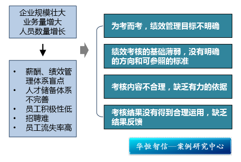成立之初,与其他企业类似,该购物中心也存在“重经营轻管理”的问题。企业发展初期,其管理上的问题并不显著,但是,随着企业规模的逐步发展,业务量逐渐增大,人员数量也有了大规模的增长,人力资源管理方面的问题也逐步暴露出来。访谈中,该购物中心的领导反映, “员工流失率相对较高,招聘存在难度,员工的工作积极性也不高……”。通过深入的访谈和走访,华恒智信顾问团队对该公司的人力资源管理体系进行了全面诊断,指出该购物中心的人才储备体系并不完善,其薪酬管理体系及绩效考核体系都存在盲点,整体的人力资源管理水平亟待提升,以为企业发展提供有力的人力资源支持。同时,华恒智信结合企业的发展阶段和管理现状,指出该购物中心现阶段的重点改进方向——搭建科学、完善的绩效考核体系。该购物中心在绩效考核体系所存在的问题主要包括以下几个方面:
