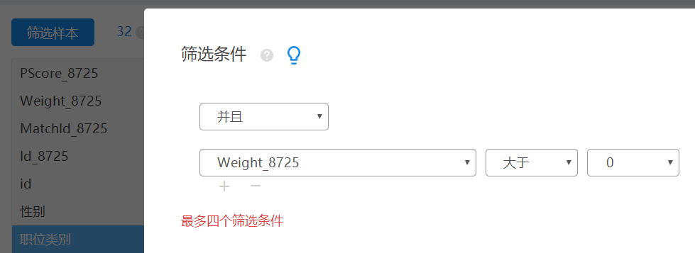 在SPSSAU的“可视化”栏目下,选择【核密度图】,打开【筛选样本】,输入条件:Weight > 0 ,这样做从数据集中筛选出匹配成功的32人数据,用于绘图。