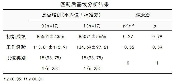 如上表所示,匹配后,两组人群在初始成绩、工作经验、职位类别上差异无统计学意义(均P值>0.05)。即,匹配后基线特征由有差异趋于一致、均衡。综合以上三项结果,本例认为匹配后培训组、未培训组两组在特征上达到均衡,匹配效果良好。