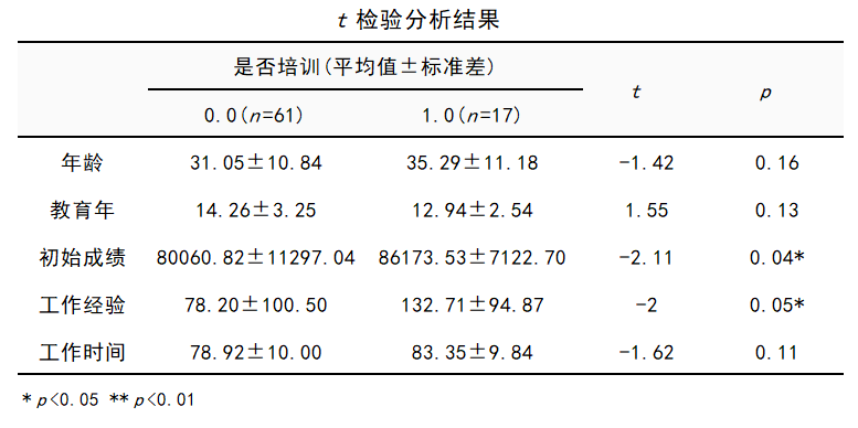 由上表结果可知,两组员工在初始工作成绩、工作经验上存在统计学差异(均P值<0.05)。而在年龄、教育年、工作时间上无差异。