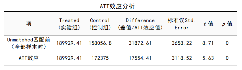 在SPSSAU中,这项工作称之为ATT效应分析。本例的结果: