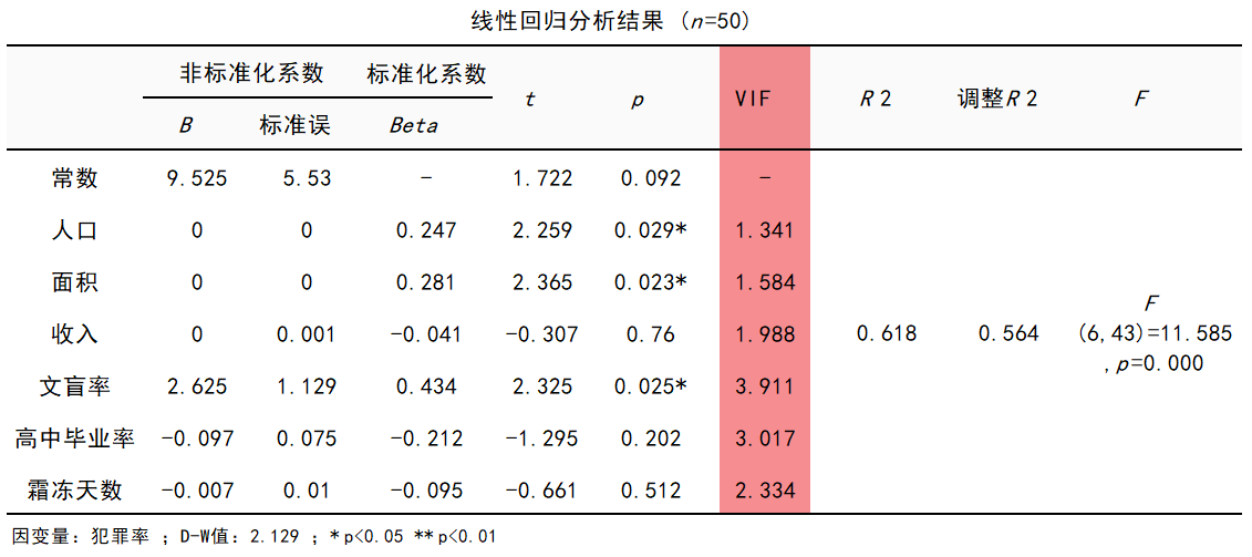就本案例来说,以犯罪率为因变量,专业上主张的6个因素,人口、面积、收入、文盲率、高中毕业率、霜冻天数,经多重线性逐步回归分析后,最后我们发现人口、文盲率对犯罪率有显著影响,其他4个自变量对因变量的影响无统计学意义。