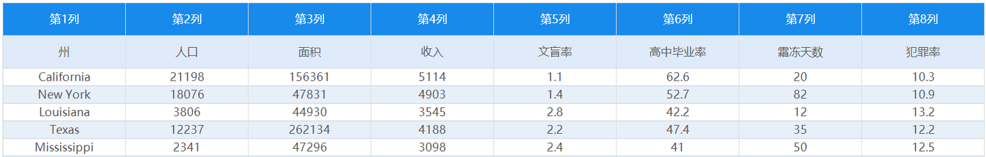 某研究收集到美国50个州关于犯罪率的一组数据,包括人口、面积、收入、文盲率、高中毕业率、霜冻天数、犯罪率共7个指标,现在我们想考察一下州犯罪率和哪些指标有关。数据上传SPSSAU后,在 “我的数据”中查看浏览原始数据,前5行数据如下: