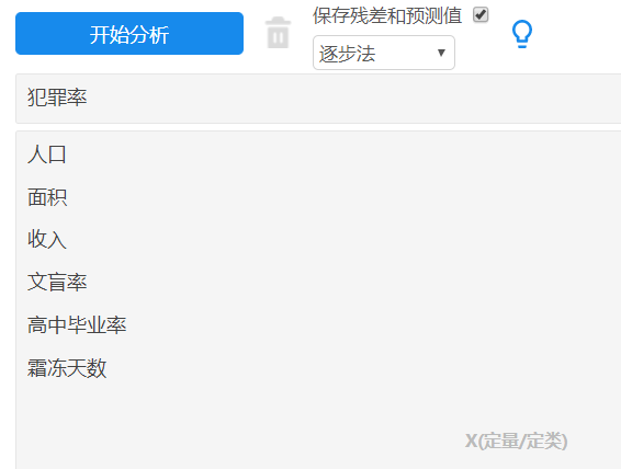 在“进阶方法”栏目下,选择【逐步回归】,将犯罪率拖拽至【定量Y】框内,人口、面积等6个自变量拖拽至【定量/定类X】框内。默认勾选【保存残差和预测值】,默认选择【逐步法】进行回归。最后点击“开始分析”即可。