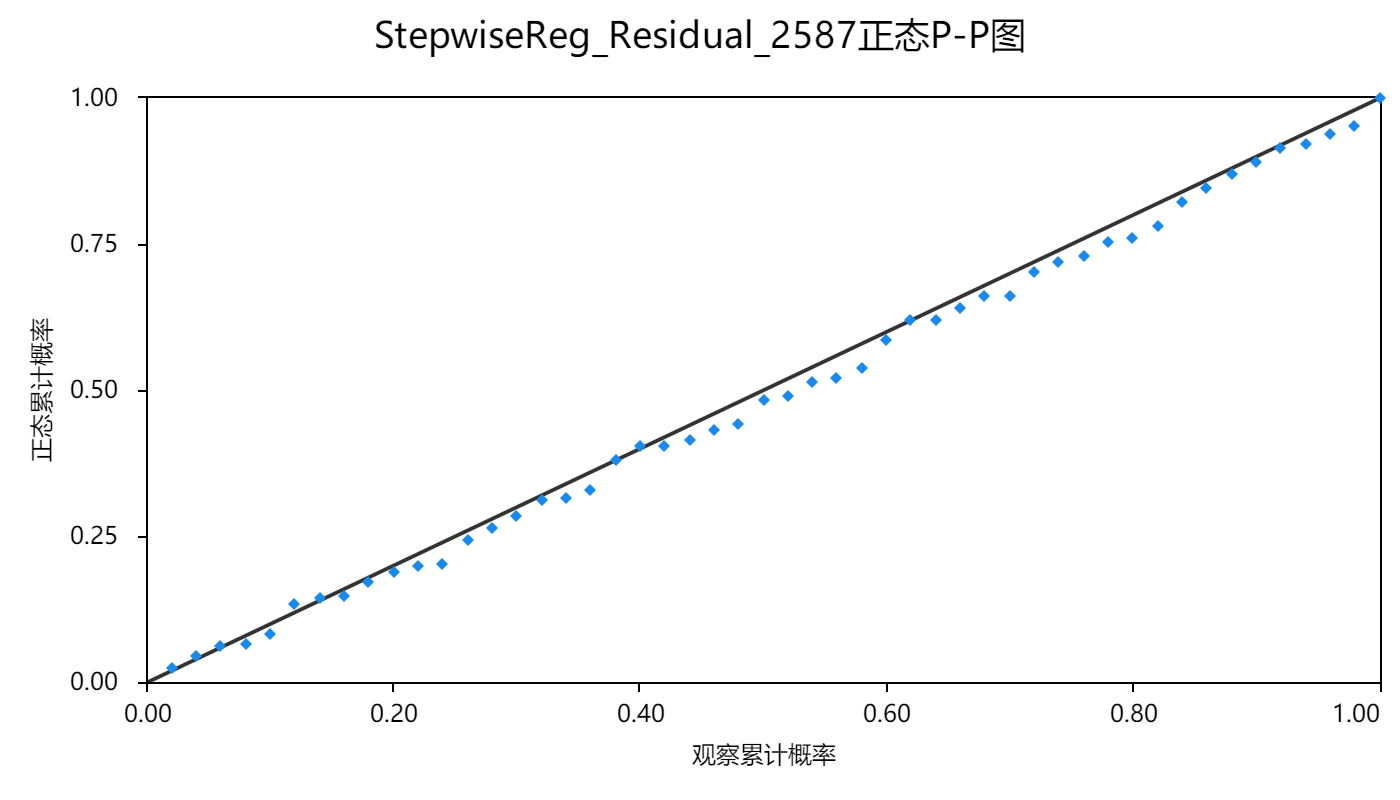 在“可视化”栏目中,选择【PP图QQ图】,将Residual数据移入【分析项】即可绘制出残差的PP图,用于判断残差是否服从正态分布。