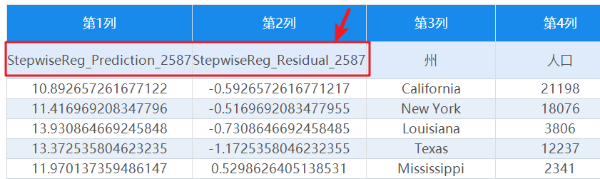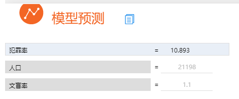 如上图9所示,在【逐步回归】的结果页面中,找到【模型预测】,直接输入人口值、文盲率值,我们以California州的数据为例,来做验证。依次输入21198、1.1,预测犯罪率为10.893,本例原始中真值为10.3,有微小误差。