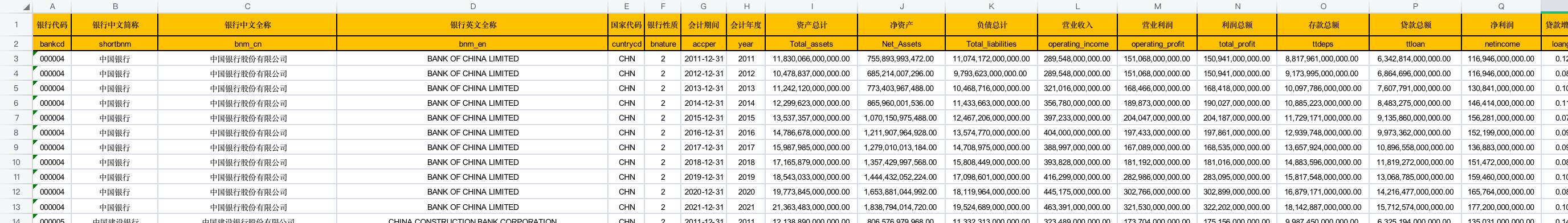 - cuntrycd [国家代码] - 银行所属国家代码:中国CHN