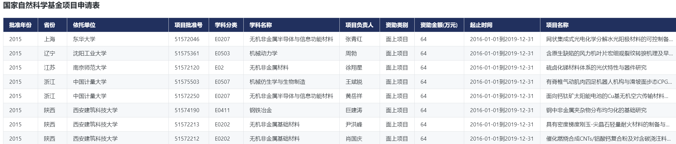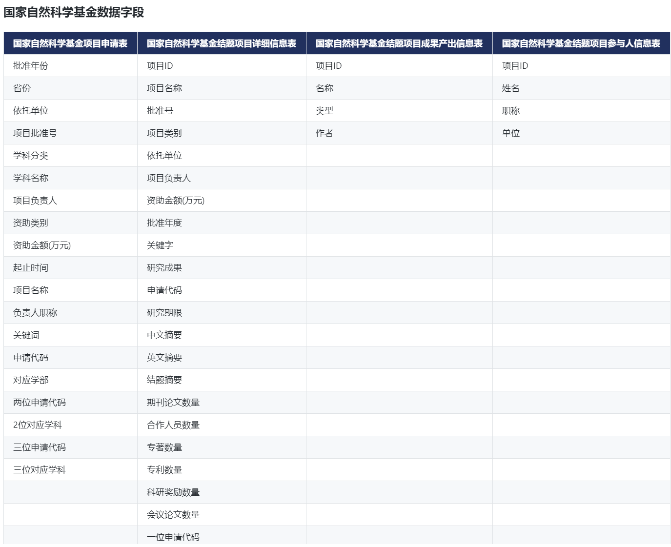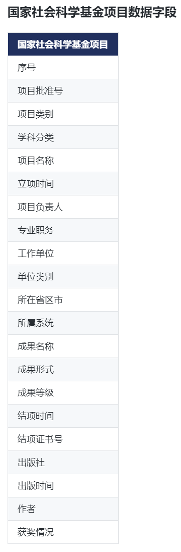 国家基金项目数据包含2019年度及以前的所有国家自然科学基金和社会科学基金项目,除立项项目的相关信息外,还涵盖详细项目负责人的信息、单位情况、成果情况等多方面的内容。