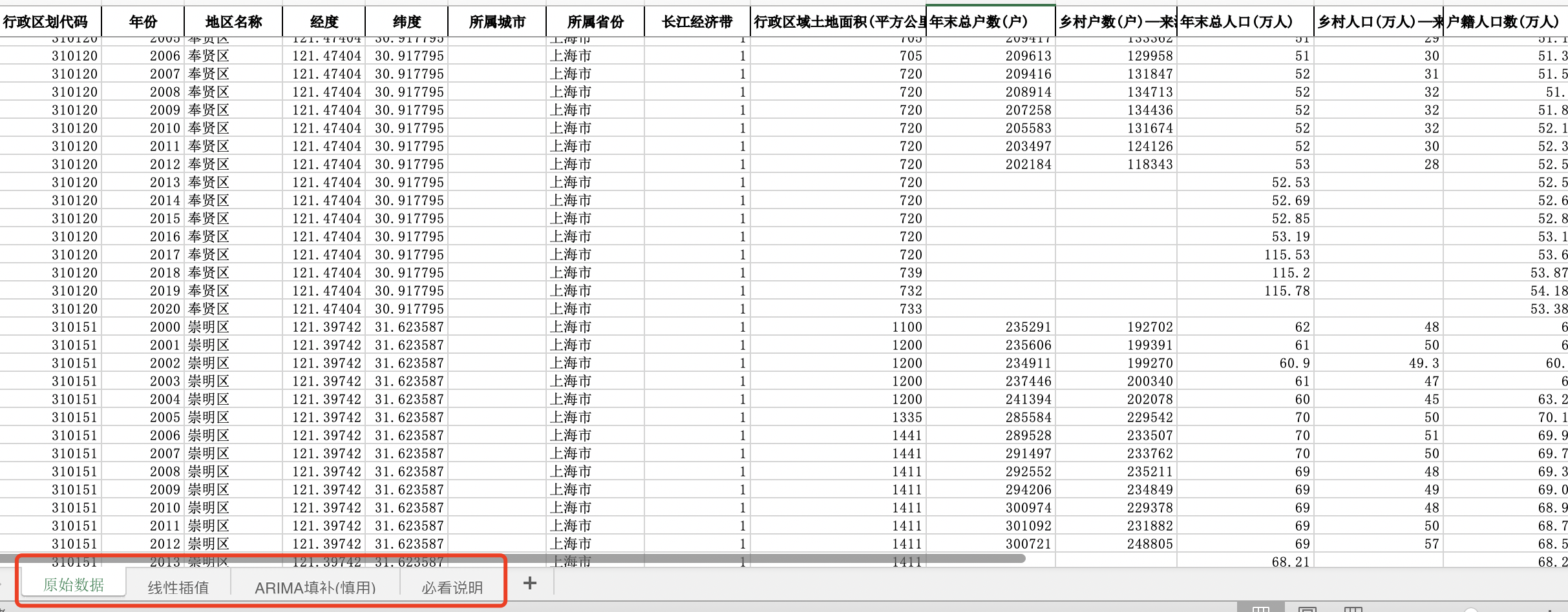 行政区划代码、年份、地区名称、经度、纬度、所属城市、所属省份、长江经济带、行政区域土地面积(平方公里)、年末总户数(户)、乡村户数(户)、年末总人口(万人)、乡村人口(万人)、户籍人口数(万人)