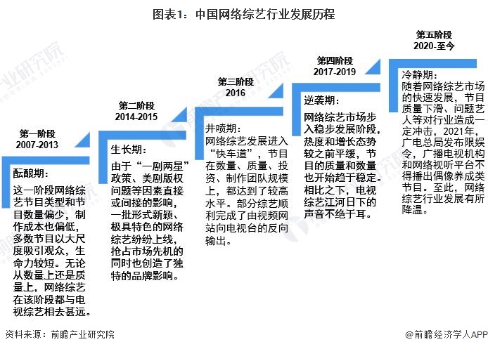 2007年,脱口秀节目《大鹏嘚吧嘚》在搜狐视频上线,首次将大众的视线聚焦到网络综艺这个新兴领域,网络综艺行业的大幕徐徐拉开。整体来看,我国网络综艺行业的发展主要经历了以下几个阶段: