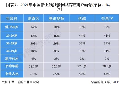 2021年各平台上新季播独播综艺用户平均年龄在26.1-28.3岁,《我的小尾巴》《恰好是少年》等新综平均年龄在22岁左右;芒果TV相较于其他平台用户平均年龄相对较高,该平台2021年播放的《遇见你》《听姐说》《时光音乐会》《再见爱人》等新综30岁以上用户占比超6成。