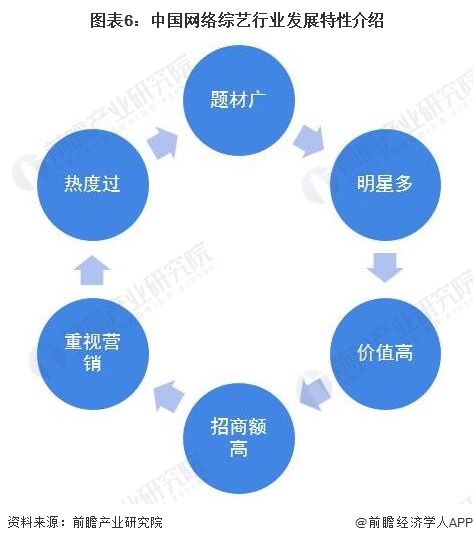 当前中国网络综艺行业主要呈现六大特点:题材类型丰富多样、众多流量明星吸睛,招商额高企,营销专业,节目热度和讨论度高涨,广告价值较高。