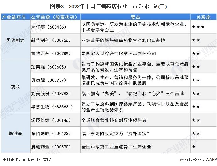 目前,我国连锁药店行业的上市公司主要分布在产业链上中游,产业链上游主要有医药制造、医药物流、药妆以及保健品相关企业,上市公司主要有:国药股份(600511)、中国医药(600056)、南京医药(600713)、上海医药(601607)、云南白药(000538)、复星医药(600196)、珀莱雅(603605)、贝泰妮(300957)、汤臣倍健(300146)等;产业链中游连锁药店上市公司主要有:老百姓(603883 )、漱玉平民(301017)、大参林(603233)、益丰药房(603939)等。