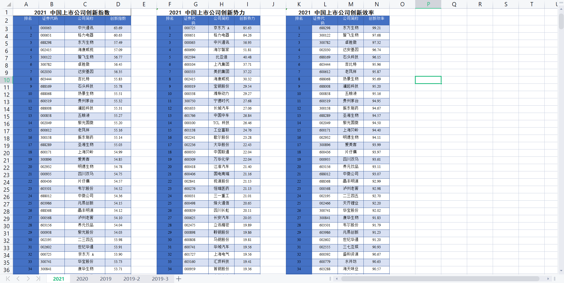 数据选取2384家中国A股上市公司为评估对象,基于创新势力和创新效率两维度构建评估模型,推出中国上市公司创新指数500强、中国上市公司创新势力200强、中国上市公司创新效率200强3项排行榜。