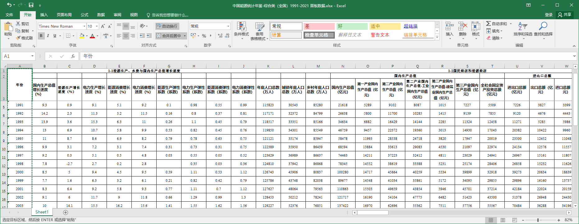 统计指标(或表头信息)大致如下: 国内生产总值增长速度(%) 能源生产增长速度(%) 电力生产增长速度(%) 能源消费增长速度(%) 电力消费增长速度(%) 能源生产弹性系数(系数) 电力生产弹性系数(系数) 能源消费弹性系数(系数) 电力消费弹性系数(系数) 年底人口总数(万人) 城镇年底人口总数(万人) 乡村年底人口总数(万人) 国内生产总值(亿元) 第一产业国内生产总值(亿元) 第二产业国内生产总值(亿元) 第二产业国内生产总值-工业国内生产总值(亿元) 第二产业国内生产总值-建筑业国内生产总值(亿元) 第三产业国内生产总值(亿元) 全社会固定资产投资总额(亿元) 进出口总额(亿元) 出口总额(亿元) 进口总额(亿元) 煤炭保有储量(亿吨) 水利资源蕴藏量(亿千瓦) 可开发量(亿千瓦) 海洋能源理论蕴藏量(亿千瓦) 万元国内生产总值能源消费量(吨标准煤/万元) 万元国内生产总值煤炭消费量(吨/万元) 万元国内生产总值焦炭消费量(吨/万元) 万元国内生产总值石油消费量(吨/万元) 万元国内生产总值原油消费量(吨/万元) 万元国内生产总值燃料油消费量(吨/万元) 万元国内生产总值电力消费量(万千瓦小时/万元) 万元国内生产总值能源消费量(吨标准煤/万元) 万元国内生产总值煤炭消费量(吨/万元) 万元国内生产总值焦炭消费量(吨/万元) 万元国内生产总值石油消费量(吨/万元) 万元国内生产总值原油消费量(吨/万元) 万元国内生产总值燃料油消费量(吨/万元) 万元国内生产总值电力消费量(万千瓦小时/万元) 万元国内生产总值能源消费量(吨标准煤/万元) 万元国内生产总值煤炭消费量(吨/万元) 万元国内生产总值焦炭消费量(吨/万元) 万元国内生产总值石油消费量(吨/万元) 万元国内生产总值原油消费量(吨/万元) 万元国内生产总值燃料油消费量(吨/万元) 万元国内生产总值电力消费量(万千瓦小时/万元) 万元国内生产总值能源消费量(吨标准煤/万元) 万元国内生产总值煤炭消费量(吨/万元) 万元国内生产总值焦炭消费量(吨/万元) 万元国内生产总值石油消费量(吨/万元) 万元国内生产总值原油消费量(吨/万元) 万元国内生产总值燃料油消费量(吨/万元) 万元国内生产总值电力消费量(万千瓦小时/万元) 万元国内生产总值能源消费量(吨标准煤/万元) 万元国内生产总值煤炭消费量(吨/万元) 万元国内生产总值焦炭消费量(吨/万元) 万元国内生产总值石油消费量(吨/万元) 万元国内生产总值原油消费量(吨/万元) 万元国内生产总值燃料油消费量(吨/万元) 万元国内生产总值电力消费量(万千瓦小时/万元) 万元国内生产总值能源消费量(吨标准煤/万元) 万元国内生产总值煤炭消费量(吨/万元) 万元国内生产总值焦炭消费量(吨/万元) 万元国内生产总值石油消费量(吨/万元) 万元国内生产总值原油消费量(吨/万元) 万元国内生产总值燃料油消费量(吨/万元) 万元国内生产总值电力消费量(万千瓦小时/万元) 能源加工转换总效率(%) 发电及电站供热转换效率(%) 炼焦加工转换效率(%) 炼油加工转换效率(%) 人均能源生产量(千克标准煤) 人均原煤生产量(千克) 人均原油生产量(千克) 人均电力生产量(千瓦小时) 人均能源消费量(千克标准煤) 人均煤炭/原煤消费量(千克) 人均石油/原油消费量(千克) 人均电力消费量(千瓦小时) 全国人均生活用能量(千克标准煤) 人均煤炭生活用量(千克) 人均电力生活用量(千瓦小时) 人均液化石油气生活用量(千克) 人均天燃气生活用量(立方米) 人均煤气生活用量(立方米) 城镇人均生活用能量(千克标准煤) 农村人均生活用能量(千克标准煤) 铁路机车(辆) 蒸汽机车(辆) 内燃机车(辆) 电力机车(辆) 铁路客车(辆) 铁路货车(辆) 民用汽车(万辆) 载客汽车(万辆) 载货汽车(万辆) 其他机动车(万辆) 公路部门营运车辆(万辆) 私人汽车(万辆) 民航飞机(架) 民用运输船舶(艘) 机动船(艘) 驳船(艘) 私人运输船舶(艘) 煤进口量(万吨) 焦炭进口量(万吨) 原油进口量(万吨) 汽油进口量(万吨) 煤油进口量(万吨) 柴油进口量(万吨) 燃料油进口量(万吨) 液化石油气进口量(万吨) 其他石油制品进口量(万吨) 天然气进口量(亿立方米) 电力进口量(亿千瓦小时) 煤出口量(万吨) 焦炭、半焦炭出口量(万吨) 原油出口量(万吨) 汽油出口量(万吨) 煤油出口量(万吨) 柴油出口量(万吨) 燃料油出口量(万吨) 液化石油气出口量(万吨) 其他石油制品出口量(万吨) 天然气出口量(亿立方米) 电力出口量(亿千瓦小时) 钢材进口量(万吨) 钢铁丝进口量(吨) 未锻造的铜及铜合金进口量(万吨) 未锻造的铝及铝合金进口量(万吨) 锌及锌合金进口量(吨) 烧碱进口量(吨) 纯碱进口量(万吨) 肥料进口量(万吨) 纸浆进口量(万吨) 纺织用合成纤维进口量(万吨) 水泥出口量(万吨) 平板玻璃出口量(万平方米) 钢材出口量(万吨) 钢铁丝出口量(吨) 铜材出口量(吨) 铝材出口量(万吨) 未锻造的锌及锌合金出口量(吨) 纸及纸板(未切成形)出口量(万吨)