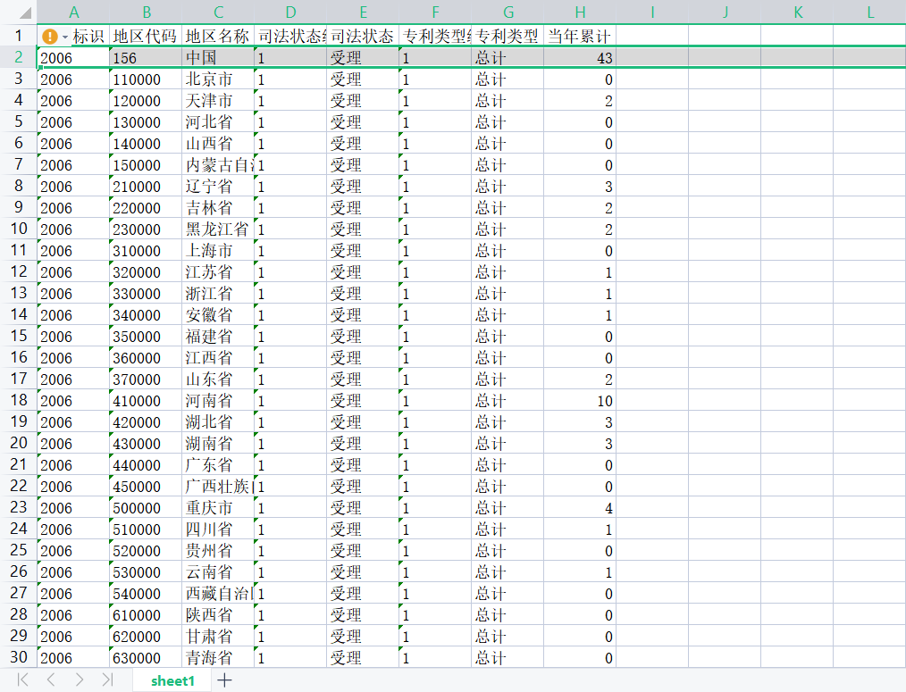 2006年-2018年专利数据-行政执法情况-各地区其他纠纷专利执法统计表(年).xlsx