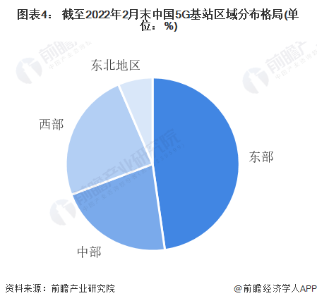 从我国5G建设的区域分布来看,截至2月份末,东、中、西部和东北地区5G基站分别达到71.9万、32.4万、36.6万、9.7万个,占本地区移动电话基站总数的比重分别为16.6%、14.8%、12.9%、14.2%,东部地区占比领先。