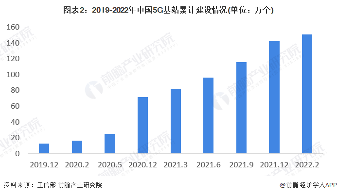 我国5G用户数量的快速增长离不开对5G基础设施的建设和投资。2019年以来,我国5G基站建设数量快速增长,截至2截至2022年2月份末,我国5G基站总数达150.6万个,占移动基站总数的15%。其中,1-2月份新建5G基站8.1万个。