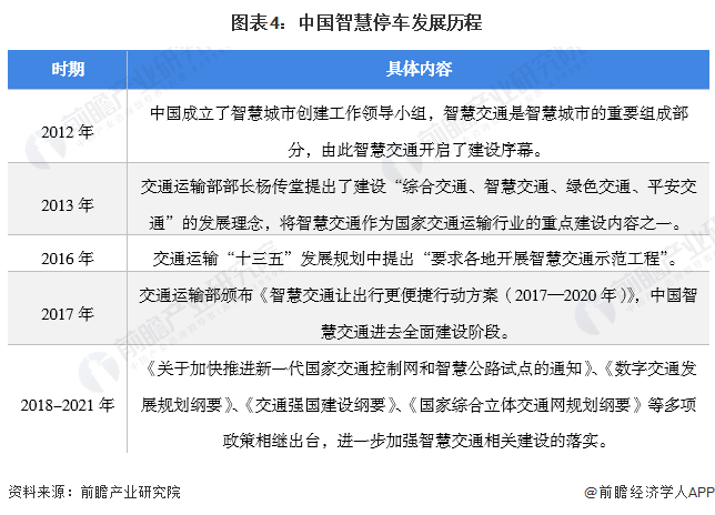 中国智慧交通建设起步时间较晚,2012年成立智慧城市创建工作小组开启了智慧交通的建设序幕,2017年交通运输部颁发智慧交通行动方案标志着中国智慧交通开启全面建设,近年来,国家不断出台多项引导性政策支持智慧交通行业发展,当前中国智慧停车行业处于快速发展阶段。