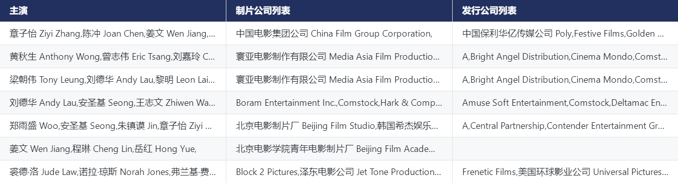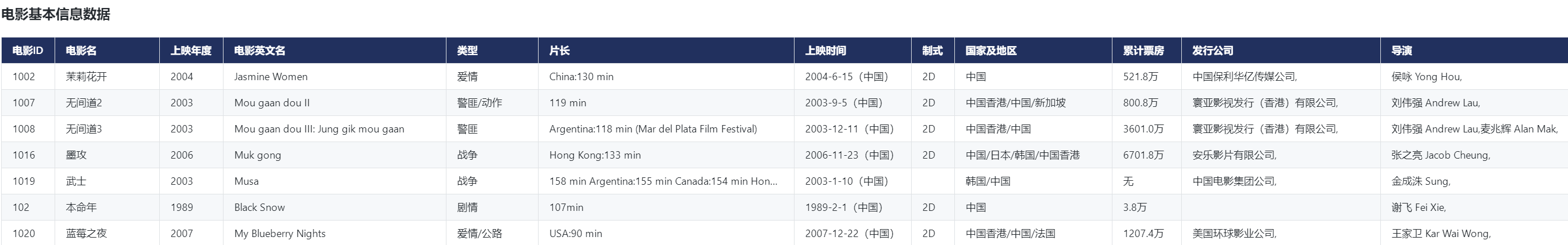 中国电影票房数据,涵盖了电影名、上映年度、国家及地区、累计票房、导演、主演、场均人次、单周票房、制片/发行公司。