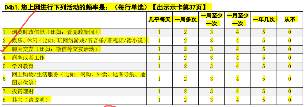 css2019 中国社会状况综合调查问卷 互联网使用频率和Excel数据里1-6的指标如何对应呢