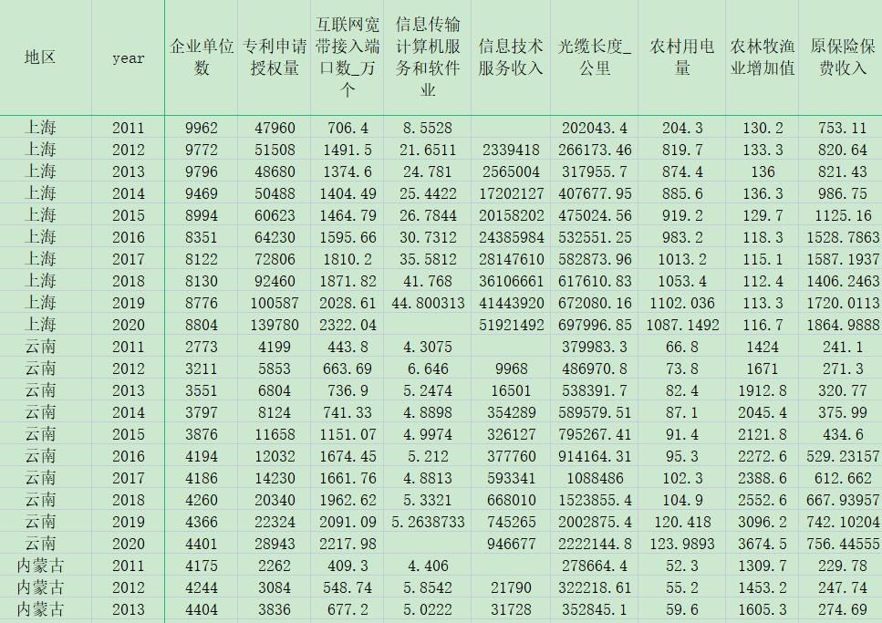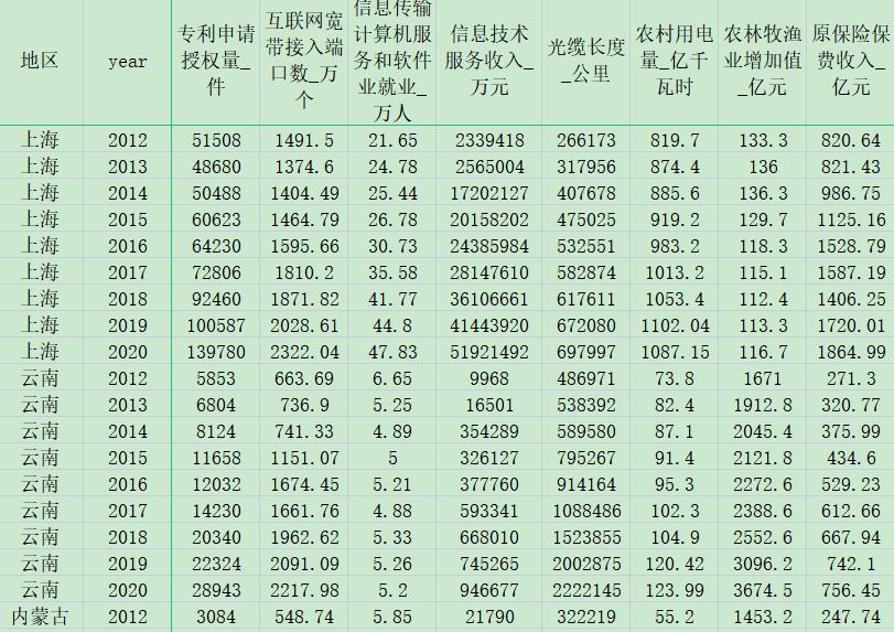 地区 year 专利申请授权量_件 互联网宽带接入端口数_万个 信息传输计算机服务和软件业就业_万人 信息技术服务收入_万元 光缆长度_公里 农村用电量_亿千瓦时 农林牧渔业增加值_亿元 原保险保费收入_亿元 快递量_万件 图书馆_个 基建投资固定资产_亿元 工业增加值_亿元 普通高等学校数_个 本专科授予学位数_人 人均交通和通信消费支出_元 人均文教娱乐消费支出_元 电信业务量_亿元 社会消费品零售总额_亿元 移动电话交换机容量_万户 第三产业增加值_亿元 规上工业企业主营业务收入_亿元 规上工业企业科研人员全时当量_人年 规模以上工业企业新产品销售收入_万元 软件业收入_万元 手机_万台 集成电路_万块 微型计算机设备_万台 通信设备计算机及其它电子设备制造业主营业务收入_亿元 软件业企业数_个