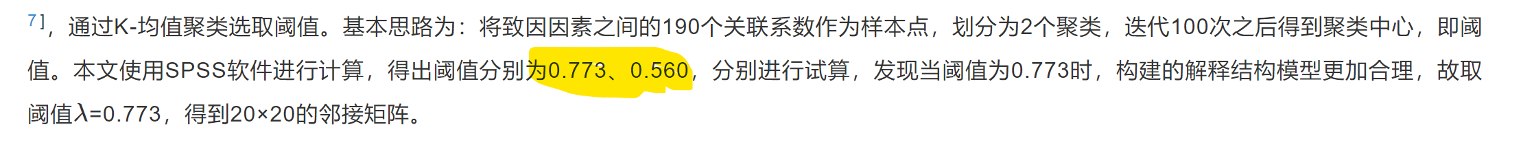 通过K-均值聚类选取阈值。基本思路为:将致因因素之间的190个关联系数作为样本点,划分为2个聚类,迭代100次之后得到聚类中心,即阈值。本文使用SPSS软件进行计算,得出阈值分别为