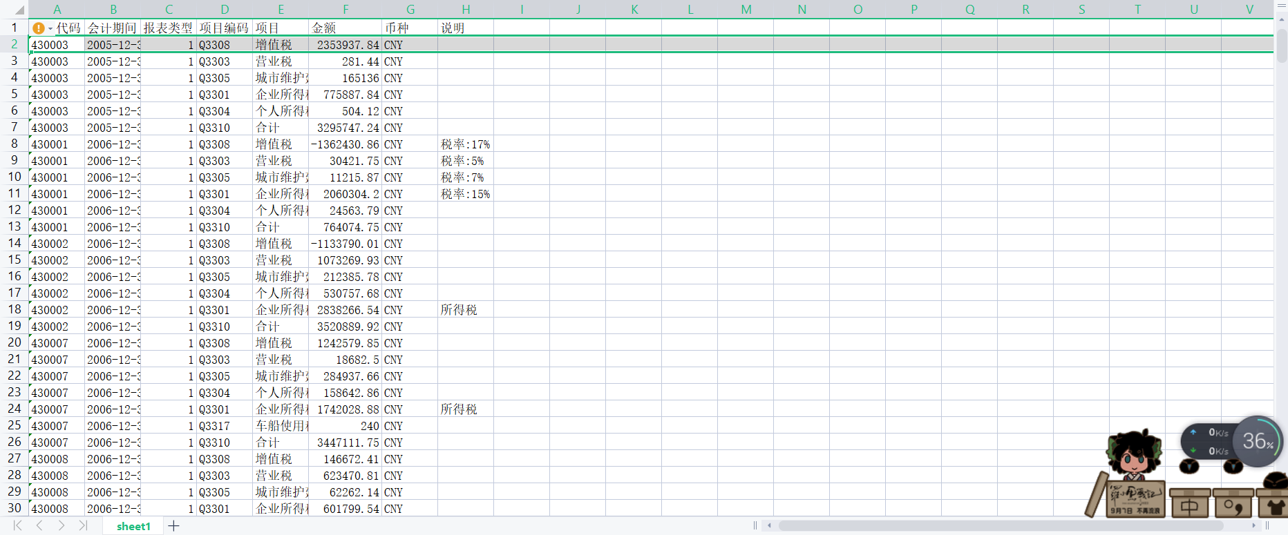 | [项目编码] | Q3301企业所得税;Q3302土地增值税;Q3303营业税;Q3304个人所得税;Q3305城市维护建设税;Q3306教育费附加;Q3307房产税;Q3308增值税;Q3309其他;Q3310合计;Q3311地方教育费附加;Q3312水利建设基金;Q3313土地使用税;Q3314印花税;Q3315资源税;Q3316消费税;Q3317车船使用税。 |