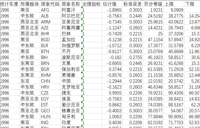 | [治理指标] | 1=话语权和责任;2=政治稳定性;3=政府效率;4=规管质量;5=法制;6=腐败控制 |