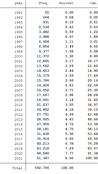 样本选择:全部A股1990-2021年数据(初始数据是从1990年开始,经过处理之后的数据起点为1991年)