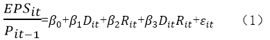 会计稳健性(C_score)。会计稳健性难以量化,如何度量成为学术界关注的热点,自Basu(1997)开创了会计稳健性定性研究以来,学者们不断探索,出现了诸多方法,主要包括Basu的反向回归模型、Ball(2006)等学者的应计现金流模型、Watts和Khan(2009)的C_score模型。考虑反向回归模型使用了内生变量(回报)、应计现金流模型存在盈余管理等对结果产生的误差,本文借鉴Watts和Khan(2009)依据Basu(1997)的模型改进的C_score方法度量企业的会计稳健性,该指标在Basu模型的基础上加入影响会计稳健性的三个主要变量,即市账比(MB)、资本结构(Lev)和公司规模(Size),它能够计算出每家公司的年度会计稳健性水平,受到学术界的广泛认可,同时在稳健性检验部分借鉴Garcia et al.的做法,使用G_score作为会计稳健性的衡量指标。Basu根据盈余和报酬之比的反向回归度量会计稳健性,见模型(1):