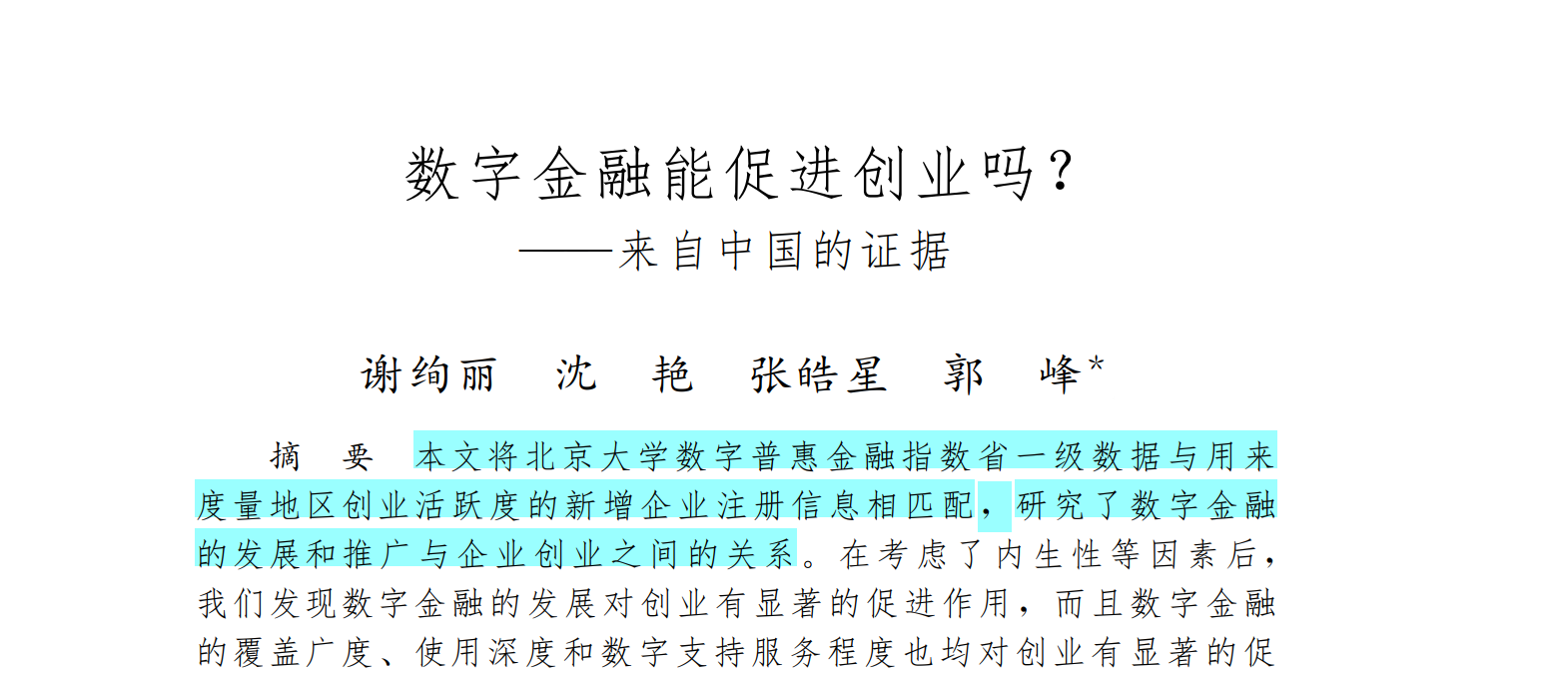 谢绚丽,沈艳,张皓星,郭峰.数字金融能促进创业吗?——来自中国的证据[J].经济学(季刊),2018,17(04):1557-1580.