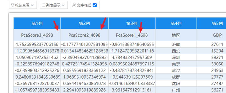 刚才我们以第一主成分为例写出来主成分计算公式,据此公式可以计算得到三个主成分的得分数据。线性组合的系数SPSSAU已经直接提供了,根据公式,我们还需要自己准备好原始数据的标准化值。