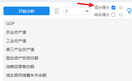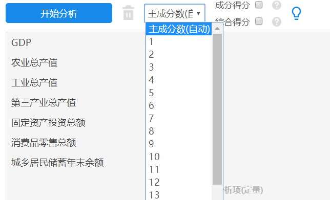 在SPSSAU的“进阶方法”栏目下选择“主成分”,将GDP等7个连续型指标变量数据拖拽至【定量分析项】,也就是说现在我们要对这7个指标进行信息浓缩,那么,浓缩为几个主成分呢?