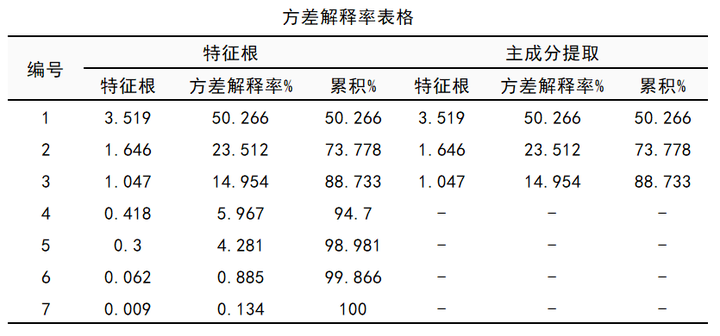 此3个主成分的方差解释率分别是50.266%、23.512%、14.954%,累积方差解释率为88.733%。这表示,第一主成分可解释我们待降维的7个指标50.266%的信息量,第二主成分可解释23.512%的信息量,第三主成分可解释14.954%。