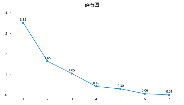碎石图形象展示各成分特征根“陡坡势能”的变化过程,落差幅度越大说明对应的成分越重要,解释能力越强。碎石图一般是前几个特征根陡坡落差幅度比较大,越往后越平缓。