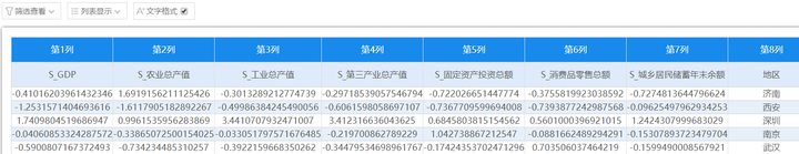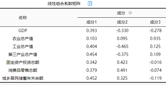 可以发现,第一主成分与GDP、工业总产值、第三产业总产值有关;第二主成分与固定资产投资总额、消费品零售总额、城乡居民储蓄年末余额有关;第三主成分与农业总产值有关。