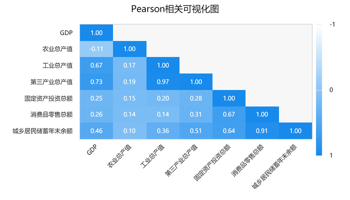 上图展示了7个指标两两之间Pearson相关系数,相关程度范围为0.10~0.97。农业总产值、固定资产投资总额、消费品零售总额与其他指标相关性普遍低于0.3,而其他指标之间的相关性则相对较高,总体看指标间有一定的相关性基础。