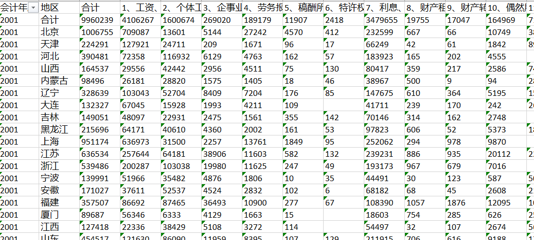 2001-2018个人所得税分地区分项目收入情况