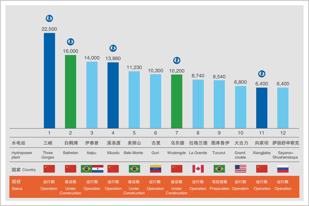 目前,全球前12大水电站,有5座在中国,分别是三峡、白鹤滩、溪洛渡、乌东德、向家坝。全球服役的70万千瓦以上机组有127台,中国就有104台。