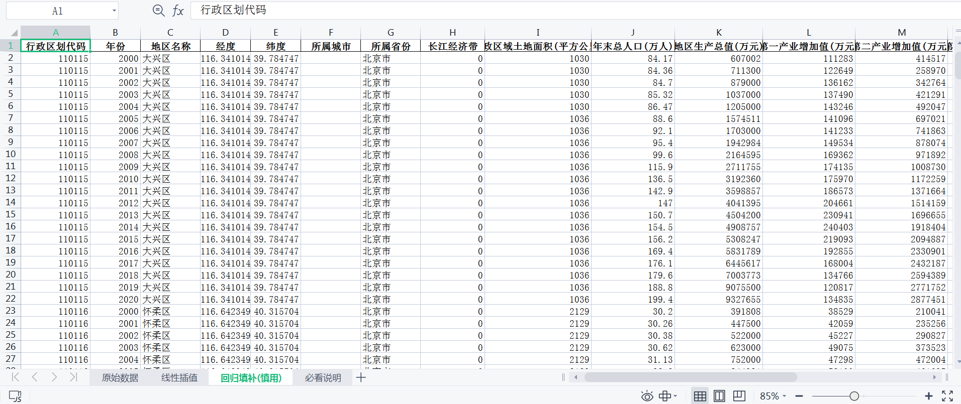 数据指标:行政区划代码、年份、地区名称、经度、纬度、所属城市、所属省份、长江经济带、行政区域土地面积(平方公里)、年末总人口(万人)、地区生产总值(万元)、第一产业增加值(万元)、第二产业增加值(万元)、第三产业增加值(万元)、人均地区生产总值(元/人)、城镇单位在岗职工平均工资(元)、城镇居民人均可支配收入(元)、农村居民人均可支配收入(元)