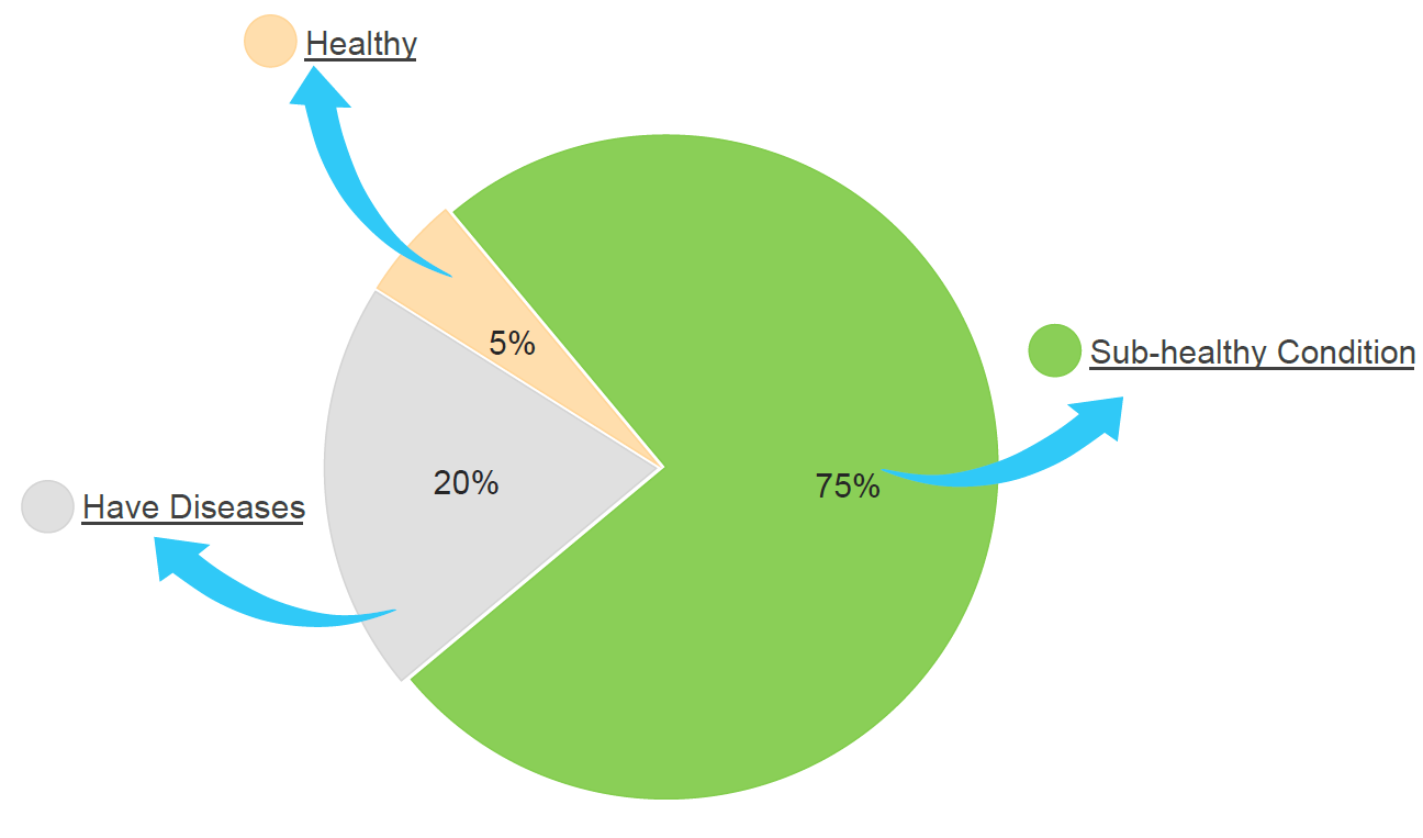 世界卫生组织(WHO)的一项全球性调查结果表明,全世界真正健康的人仅占5%, 患病的也只占20%,而75%的人处于亚健康状态。