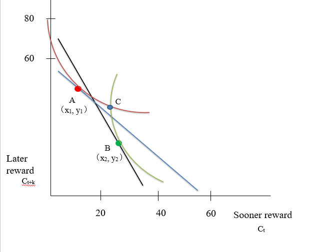现值的预算约束线和终值的预算约束线如下图选取A B两个点画出IC,两个IC相交了,说明违背了GDRP。