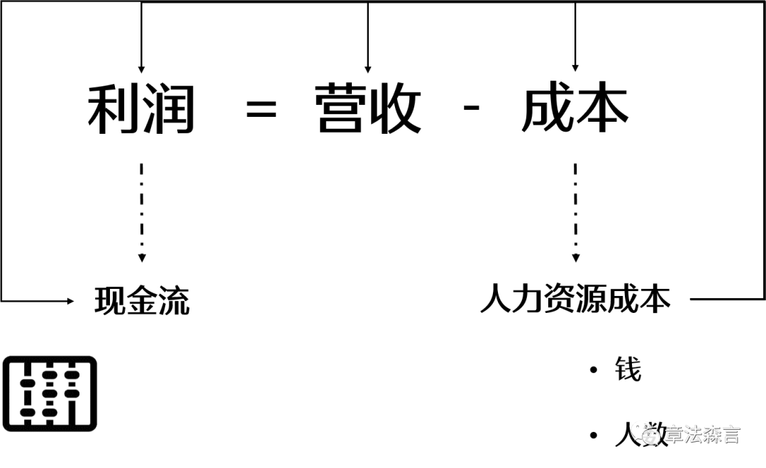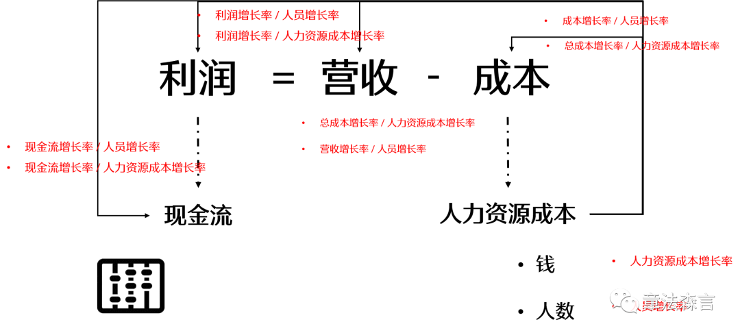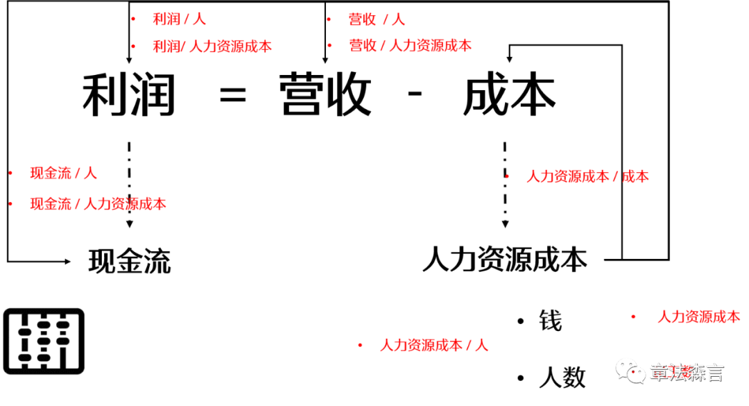 首先我们提出一个大家都很熟悉的一个组织的顶层公式,组织的目标是创造客户和利润,有了利润就有了现金流来维持整个组织的运作;利润等于营收减去成本,人力资源作为一种成本,体现在“钱"的投入和"人数"两个表征变量上,从而形成了宏观人效的“算盘”的底层结构。
